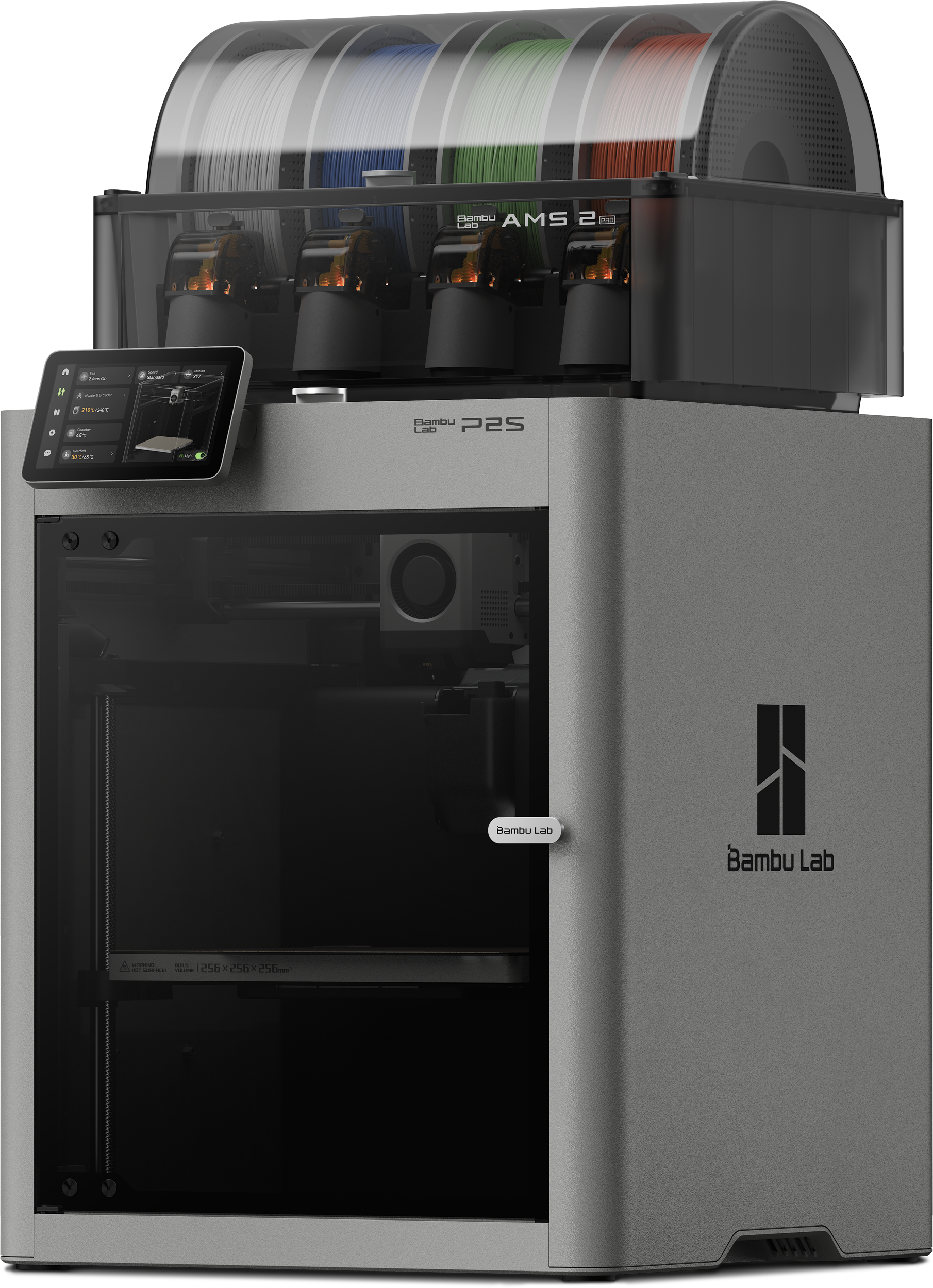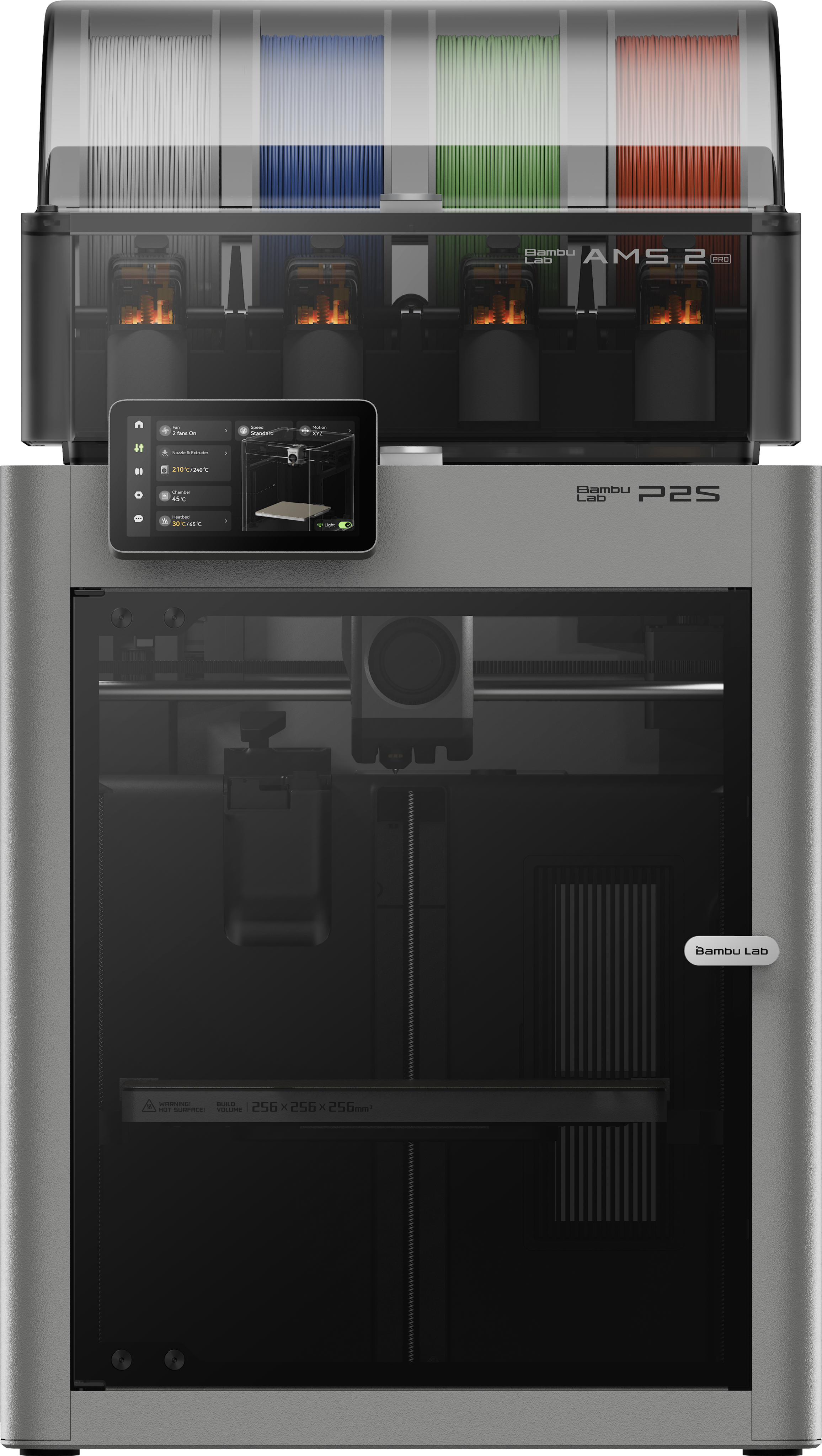 P2S обеспечивает чистую производительность благодаря сервоприводу, адаптивному управлению потоком воздуха, ИИ-обнаружению ошибок и автоматической калибровке потока для безупречной печати в рекордные сроки. AMS 2 Pro добавляет интеллектуальную автоматизацию: четыре активных положения катушки, интеллектуальную сушку филамента, распознавание RFID и сверхбыструю смену материала для цветных или насыщенных материалов проектов без прерывания работы.