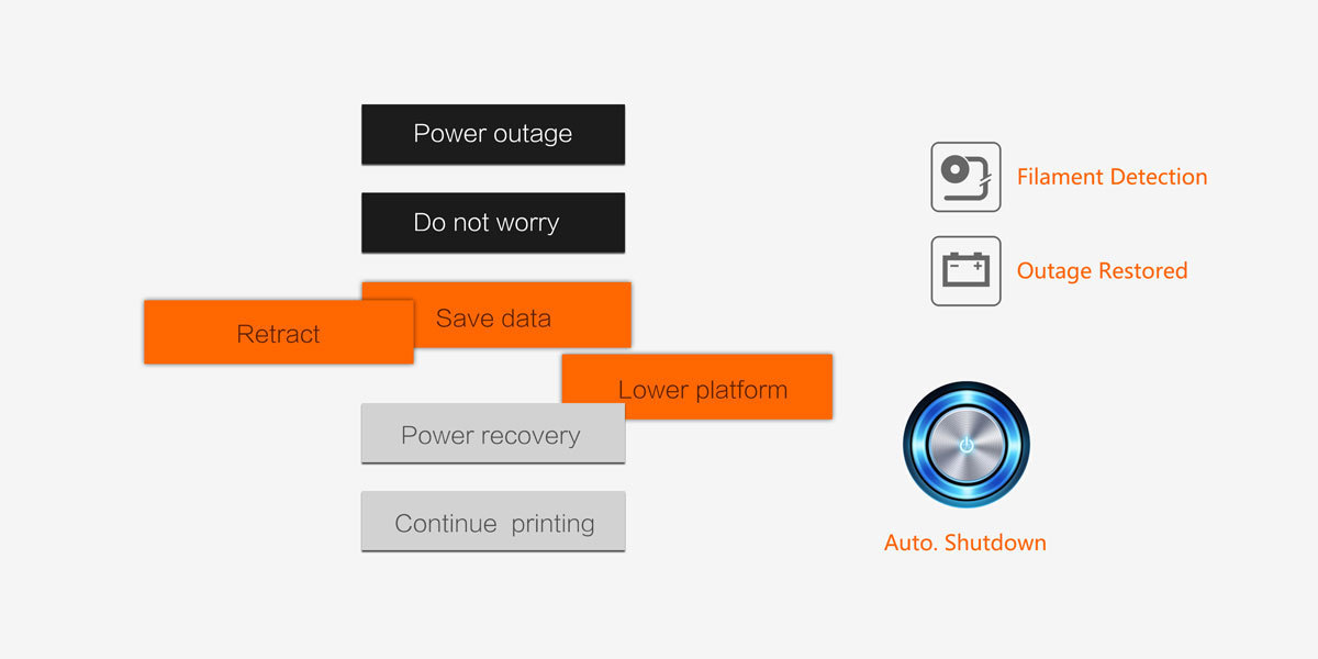 При внезапном отключении электропитания 3D принтер автоматически запоминает текущее положение, сохраняет данные печати, производит ретракт пластика и опускает платформу. Это дает возможность продолжить печать на том же месте, после возобновления электропитания.