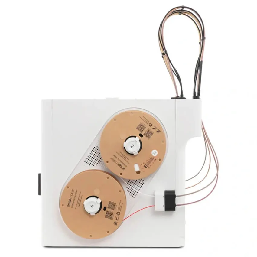Snapmaker U1 выделяется тихой работой и продуманной эргономикой. Держатели катушек оснащены RFID-считывателями, которые автоматически определяют тип и цвет фирменного пластика. Система подачи материала исключает запутывание, а прозрачный лоток для отходов под парковкой экструдеров делает обслуживание принтера быстрым и чистым.