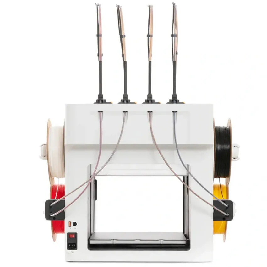 Каждая из четырех головок оснащена собственным экструдером и хотендом, которые поддерживают рабочую температуру в режиме ожидания. Это позволяет переключаться между цветами или материалами (например, жестким PETG и гибким TPU) практически мгновенно, сохраняя чистоту переходов и высокую конструкционную прочность изделия.