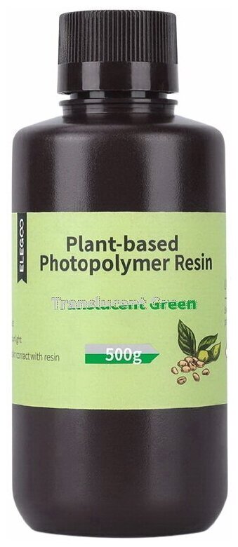 Фотополимер Elegoo Plant-Based Resin полупрозрачный зеленый — новинка от одного из мировых лидеров в производстве расходных материалов для DLP/LCD/LED печати. Являясь фотополимером на растительной основе, эта смола состоит в основном из сои, практически не имеет запаха и не выделяет едких паров. При этом изделия из неё обладают впечатляющими механическими свойствами. Elegoo Plant-Based Resin станет отличным выбором для использования дома и в образовательных учреждениях.