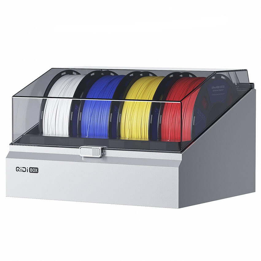- Хранение после печати: Вы можете оставлять катушки внутри QIDI Box после завершения работы. Герметичный корпус сохранит их сухими значительно дольше, чем открытый держатель.